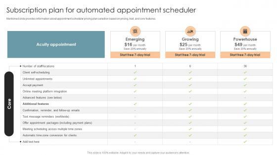Mentioned slide provides information about appointment scheduler pricing plan selection based on pricing, trail, and core features.Here you can discover an assortment of the finest PowerPoint and Google Slides templates. With these templates, you can create presentations for a variety of purposes while simultaneously providing your audience with an eye-catching visual experience. Download Subscription Plan For Automated Appointment Scheduler Office Process Optimization To Increase Cost Efficiency to deliver an impeccable presentation. These templates will make your job of preparing presentations much quicker, yet still, maintain a high level of quality. Slidegeeks has experienced researchers who prepare these templates and write high-quality content for you. Later on, you can personalize the content by editing the Subscription Plan For Automated Appointment Scheduler Office Process Optimization To Increase Cost Efficiency. Mentioned slide provides information about appointment scheduler pricing plan selection based on pricing, trail, and core features.