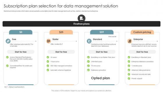 Mentioned slide provides information about available subscription plan for data management such as free, started, standard and enterprise.This Subscription Plan Selection For Data Management Office Process Optimization To Increase Cost Efficiency from Slidegeeks makes it easy to present information on your topic with precision. It provides customization options, so you can make changes to the colors, design, graphics, or any other component to create a unique layout. It is also available for immediate download, so you can begin using it right away. Slidegeeks has done good research to ensure that you have everything you need to make your presentation stand out. Make a name out there for a brilliant performance. Mentioned slide provides information about available subscription plan for data management such as free, started, standard and enterprise.