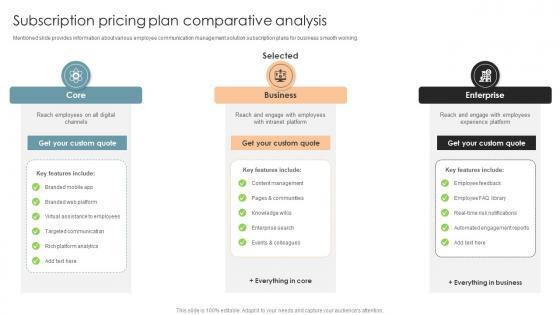 Mentioned slide provides information about various employee communication management solution subscription plans for business smooth working.Take your projects to the next level with our ultimate collection of Subscription Pricing Plan Comparative Analysis Office Process Optimization To Increase Cost Efficiency. Slidegeeks has designed a range of layouts that are perfect for representing task or activity duration, keeping track of all your deadlines at a glance. Tailor these designs to your exact needs and give them a truly corporate look with your own brand colors they will make your projects stand out from the rest Mentioned slide provides information about various employee communication management solution subscription plans for business smooth working.