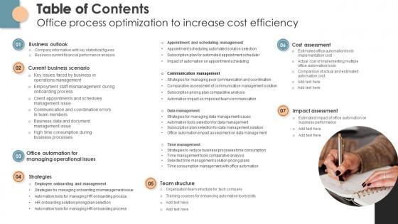 Do you know about Slidesgeeks Table Of Contents Office Process Optimization To Increase Cost Efficiency These are perfect for delivering any kind od presentation. Using it, create PowerPoint presentations that communicate your ideas and engage audiences. Save time and effort by using our pre-designed presentation templates that are perfect for a wide range of topic. Our vast selection of designs covers a range of styles, from creative to business, and are all highly customizable and easy to edit. Download as a PowerPoint template or use them as Google Slides themes. Our Table Of Contents Office Process Optimization To Increase Cost Efficiency are topically designed to provide an attractive backdrop to any subject. Use them to look like a presentation pro.