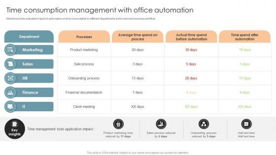 Mentioned slide evaluated impact of automation on time consumption by different departments led to improved business workflow.This Time Consumption Management With Office Process Optimization To Increase Cost Efficiency from Slidegeeks makes it easy to present information on your topic with precision. It provides customization options, so you can make changes to the colors, design, graphics, or any other component to create a unique layout. It is also available for immediate download, so you can begin using it right away. Slidegeeks has done good research to ensure that you have everything you need to make your presentation stand out. Make a name out there for a brilliant performance. Mentioned slide evaluated impact of automation on time consumption by different departments led to improved business workflow.