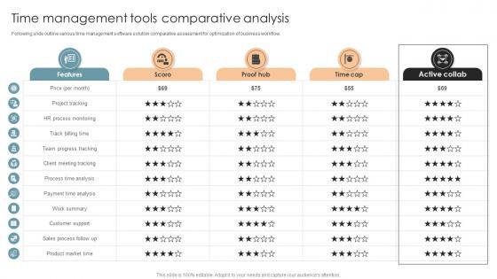 Following slide outline various time management software solution comparative assessment for optimization of business workflow.Take your projects to the next level with our ultimate collection of Time Management Tools Comparative Analysis Office Process Optimization To Increase Cost Efficiency. Slidegeeks has designed a range of layouts that are perfect for representing task or activity duration, keeping track of all your deadlines at a glance. Tailor these designs to your exact needs and give them a truly corporate look with your own brand colors they will make your projects stand out from the rest Following slide outline various time management software solution comparative assessment for optimization of business workflow.