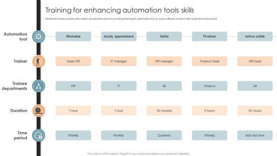 Mentioned slide provides information about action plan for providing training for automation tool by each software solution with respective time period.Do you know about Slidesgeeks Training For Enhancing Automation Tools Skills Office Process Optimization To Increase Cost Efficiency These are perfect for delivering any kind od presentation. Using it, create PowerPoint presentations that communicate your ideas and engage audiences. Save time and effort by using our pre-designed presentation templates that are perfect for a wide range of topic. Our vast selection of designs covers a range of styles, from creative to business, and are all highly customizable and easy to edit. Download as a PowerPoint template or use them as Google Slides themes. Mentioned slide provides information about action plan for providing training for automation tool by each software solution with respective time period.
