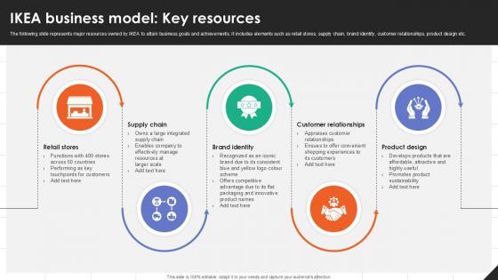 The following slide represents major resources owned by IKEA to attain business goals and achievements. It includes elements such as retail stores, supply chain, brand identity, customer relationships, product design etc. Welcome to our selection of the IKEA Business Model Key Resources IKEAs Successful Market Expansion PPT Slide Strategy SS V. These are designed to help you showcase your creativity and bring your sphere to life. Planning and Innovation are essential for any business that is just starting out. This collection contains the designs that you need for your everyday presentations. All of our PowerPoints are 100Percent editable, so you can customize them to suit your needs. This multi-purpose template can be used in various situations. Grab these presentation templates today. The following slide represents major resources owned by IKEA to attain business goals and achievements. It includes elements such as retail stores, supply chain, brand identity, customer relationships, product design etc.
