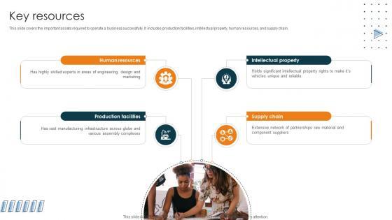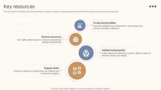 This slide covers the important assets required to operate a business successfully. It includes production facilities, intellectual property, human resources, and supply chain. Slidegeeks is here to make your presentations a breeze with Key Resources Car Manufacturing Company Business Model BMC SS V With our easy-to-use and customizable templates, you can focus on delivering your ideas rather than worrying about formatting. With a variety of designs to choose from, you are sure to find one that suits your needs. And with animations and unique photos, illustrations, and fonts, you can make your presentation pop. So whether you are giving a sales pitch or presenting to the board, make sure to check out Slidegeeks first This slide covers the important assets required to operate a business successfully. It includes production facilities, intellectual property, human resources, and supply chain.