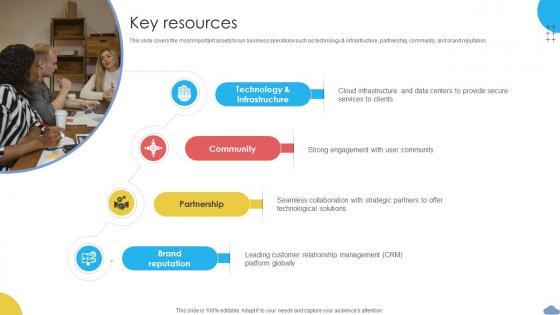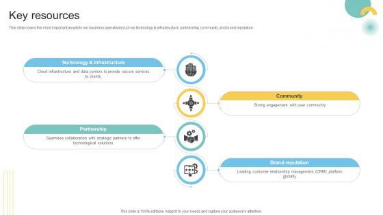 This slide covers the most important assets to run business operations such as technology and infrastructure, partnership, community, and brand reputation. Slidegeeks is here to make your presentations a breeze with Key Resources Cloud Based CRM Business Model BMC SS V With our easy-to-use and customizable templates, you can focus on delivering your ideas rather than worrying about formatting. With a variety of designs to choose from, you are sure to find one that suits your needs. And with animations and unique photos, illustrations, and fonts, you can make your presentation pop. So whether you are giving a sales pitch or presenting to the board, make sure to check out Slidegeeks first This slide covers the most important assets to run business operations such as technology and infrastructure, partnership, community, and brand reputation.
