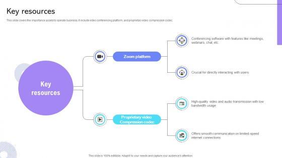 This slide covers the importance assets to operate business. It include video conferencing platform, and proprietary video compression codec. Slidegeeks is here to make your presentations a breeze with Key Resources Cloud Communication Company Business Model BMC SS V With our easy-to-use and customizable templates, you can focus on delivering your ideas rather than worrying about formatting. With a variety of designs to choose from, you are sure to find one that suits your needs. And with animations and unique photos, illustrations, and fonts, you can make your presentation pop. So whether you are giving a sales pitch or presenting to the board, make sure to check out Slidegeeks first This slide covers the importance assets to operate business. It include video conferencing platform, and proprietary video compression codec.