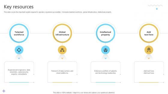 This slide covers the important assets required to operate a business successfully. It includes talented workforce, global infrastructure, intellectual property. Slidegeeks is here to make your presentations a breeze with Key Resources Cloud Computing Services Business Model PPT PowerPoint With our easy-to-use and customizable templates, you can focus on delivering your ideas rather than worrying about formatting. With a variety of designs to choose from, you are sure to find one that suits your needs. And with animations and unique photos, illustrations, and fonts, you can make your presentation pop. So whether you are giving a sales pitch or presenting to the board, make sure to check out Slidegeeks first This slide covers the important assets required to operate a business successfully. It includes talented workforce, global infrastructure, intellectual property.