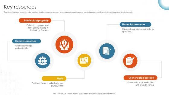 This slide showcases key assets of the company to deliver innovative products, encompassing human resources, physical assets, users, financial resources, and user-created projects. Slidegeeks is here to make your presentations a breeze with Key Resources Cloud Storage And Collaboration Service Business Model BMC SS V With our easy-to-use and customizable templates, you can focus on delivering your ideas rather than worrying about formatting. With a variety of designs to choose from, you are sure to find one that suits your needs. And with animations and unique photos, illustrations, and fonts, you can make your presentation pop. So whether you are giving a sales pitch or presenting to the board, make sure to check out Slidegeeks first This slide showcases key assets of the company to deliver innovative products, encompassing human resources, physical assets, users, financial resources, and user-created projects.