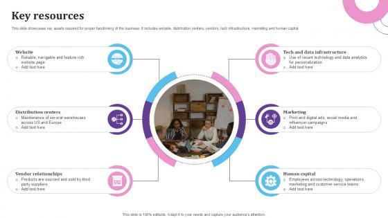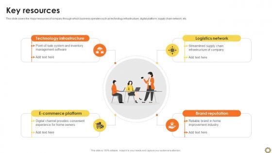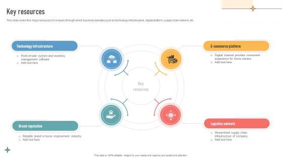 This slide covers the major resources of company through which business operates such as technology infrastructure, digital platform, supply chain network, etc.Slidegeeks is here to make your presentations a breeze with Key Resources Renovation Supplies Business Model BMC SS V With our easy-to-use and customizable templates, you can focus on delivering your ideas rather than worrying about formatting. With a variety of designs to choose from, you are sure to find one that suits your needs. And with animations and unique photos, illustrations, and fonts, you can make your presentation pop. So whether you are giving a sales pitch or presenting to the board, make sure to check out Slidegeeks first This slide covers the major resources of company through which business operates such as technology infrastructure, digital platform, supply chain network, etc.