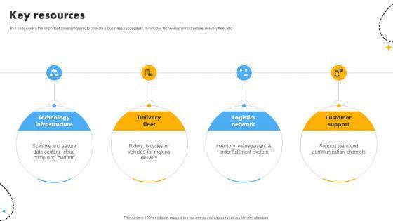 This slide covers the important assets required to operate a business successfully. It includes technology infrastructure, delivery fleet, etc. Slidegeeks is here to make your presentations a breeze with Key Resources Cost Optimization And Revenue Innovation With Deliveroo Business Model BMC SS V With our easy-to-use and customizable templates, you can focus on delivering your ideas rather than worrying about formatting. With a variety of designs to choose from, you are sure to find one that suits your needs. And with animations and unique photos, illustrations, and fonts, you can make your presentation pop. So whether you are giving a sales pitch or presenting to the board, make sure to check out Slidegeeks first This slide covers the important assets required to operate a business successfully. It includes technology infrastructure, delivery fleet, etc.