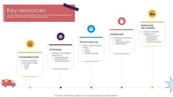 This slide showcases assets required for business operations such as transportation fleet, technology, human resources, infrastructure and supplier. Slidegeeks is here to make your presentations a breeze with Key Resources Delivery Service Provider Business Model BMC SS V With our easy-to-use and customizable templates, you can focus on delivering your ideas rather than worrying about formatting. With a variety of designs to choose from, you are sure to find one that suits your needs. And with animations and unique photos, illustrations, and fonts, you can make your presentation pop. So whether you are giving a sales pitch or presenting to the board, make sure to check out Slidegeeks first This slide showcases assets required for business operations such as transportation fleet, technology, human resources, infrastructure and supplier.