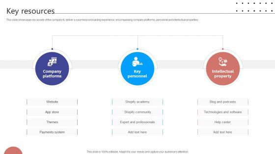 This slide showcases key assets of the company to deliver a seamless onboarding experience, encompassing company platforms, personnel and intellectual properties. Slidegeeks is here to make your presentations a breeze with Key Resources Digital Storefront Platform Business Model BMC SS V With our easy-to-use and customizable templates, you can focus on delivering your ideas rather than worrying about formatting. With a variety of designs to choose from, you are sure to find one that suits your needs. And with animations and unique photos, illustrations, and fonts, you can make your presentation pop. So whether you are giving a sales pitch or presenting to the board, make sure to check out Slidegeeks first This slide showcases key assets of the company to deliver a seamless onboarding experience, encompassing company platforms, personnel and intellectual properties.