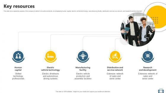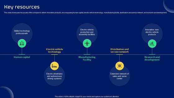 This slide showcases key assets of the company to deliver innovative products, encompassing human capital, electric vehicle technology, manufacturing facility, distribution and service network, and research and development. Slidegeeks is here to make your presentations a breeze with Key Resources Electric Vehicle Manufacturer Business Model BMC SS V With our easy-to-use and customizable templates, you can focus on delivering your ideas rather than worrying about formatting. With a variety of designs to choose from, you are sure to find one that suits your needs. And with animations and unique photos, illustrations, and fonts, you can make your presentation pop. So whether you are giving a sales pitch or presenting to the board, make sure to check out Slidegeeks first This slide showcases key assets of the company to deliver innovative products, encompassing human capital, electric vehicle technology, manufacturing facility, distribution and service network, and research and development.