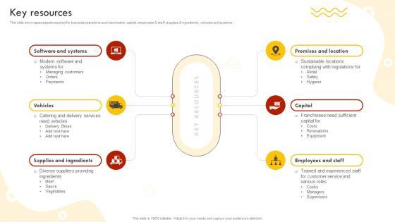 This slide showcases assets required for business operations such as location, capital, employees and staff, supplies and ingredients, vehicles and systems. Slidegeeks is here to make your presentations a breeze with Key Resources Fast Food Retail Chain Business Model BMC SS V With our easy to use and customizable templates, you can focus on delivering your ideas rather than worrying about formatting. With a variety of designs to choose from, you are sure to find one that suits your needs. And with animations and unique photos, illustrations, and fonts, you can make your presentation pop. So whether you are giving a sales pitch or presenting to the board, make sure to check out Slidegeeks first This slide showcases assets required for business operations such as location, capital, employees and staff, supplies and ingredients, vehicles and systems.