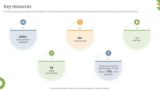 This slide showcases companys critical resources leading to its success and sales growth such as large workforce, owned brand trademarks, convenient stores for customers, vast supply chain facilities. Are you searching for a Key Resources General Merchandising Store Business Model BMC SS V that is uncluttered, straightforward, and original Its easy to edit, and you can change the colors to suit your personal or business branding. For a presentation that expresses how much effort you have put in, this template is ideal With all of its features, including tables, diagrams, statistics, and lists, its perfect for a business plan presentation. Make your ideas more appealing with these professional slides. Download Key Resources General Merchandising Store Business Model BMC SS V from Slidegeeks today. This slide showcases companys critical resources leading to its success and sales growth such as large workforce, owned brand trademarks, convenient stores for customers, vast supply chain facilities.