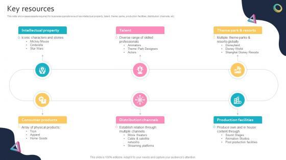 This slide showcases assets required for business operations such as intellectual property, talent, theme parks, production facilities, distribution channels, etc. Slidegeeks is here to make your presentations a breeze with Key Resources Global Entertainment Conglomerate Business Model BMC SS V With our easy-to-use and customizable templates, you can focus on delivering your ideas rather than worrying about formatting. With a variety of designs to choose from, you are sure to find one that suits your needs. And with animations and unique photos, illustrations, and fonts, you can make your presentation pop. So whether you are giving a sales pitch or presenting to the board, make sure to check out Slidegeeks first This slide showcases assets required for business operations such as intellectual property, talent, theme parks, production facilities, distribution channels, etc.