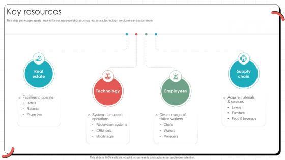 This slide showcases assets required for business operations such as real estate, technology, employees and supply chain. Slidegeeks is here to make your presentations a breeze with Key Resources Global Hotel Chain Business Model BMC SS V With our easy-to-use and customizable templates, you can focus on delivering your ideas rather than worrying about formatting. With a variety of designs to choose from, you are sure to find one that suits your needs. And with animations and unique photos, illustrations, and fonts, you can make your presentation pop. So whether you are giving a sales pitch or presenting to the board, make sure to check out Slidegeeks first This slide showcases assets required for business operations such as real estate, technology, employees and supply chain.