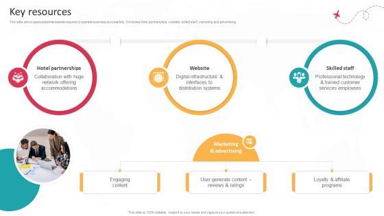 This slide showcases essential assets requires to operate business successfully. It includes hotel partnerships, website, skilled staff, marketing and advertising. Slidegeeks is here to make your presentations a breeze with Key Resources Global Travel Booking System Business Model BMC SS V With our easy-to-use and customizable templates, you can focus on delivering your ideas rather than worrying about formatting. With a variety of designs to choose from, you are sure to find one that suits your needs. And with animations and unique photos, illustrations, and fonts, you can make your presentation pop. So whether you are giving a sales pitch or presenting to the board, make sure to check out Slidegeeks first This slide showcases essential assets requires to operate business successfully. It includes hotel partnerships, website, skilled staff, marketing and advertising.