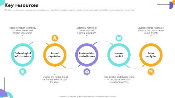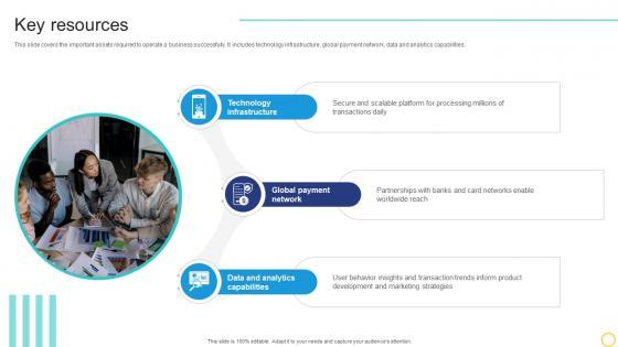 This slide covers the important assets required to operate a business successfully. It includes technological infrastructure, brand reputation, partnership and alliances, human capital and data analytics. Slidegeeks is here to make your presentations a breeze with Key Resources Payment Gateway Company Business Model BMC SS V With our easy-to-use and customizable templates, you can focus on delivering your ideas rather than worrying about formatting. With a variety of designs to choose from, you are sure to find one that suits your needs. And with animations and unique photos, illustrations, and fonts, you can make your presentation pop. So whether you are giving a sales pitch or presenting to the board, make sure to check out Slidegeeks first This slide covers the important assets required to operate a business successfully. It includes technological infrastructure, brand reputation, partnership and alliances, human capital and data analytics.