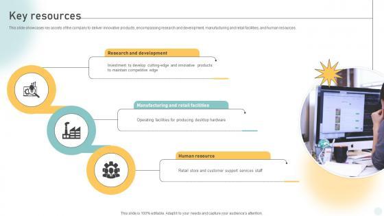 This slide showcases key assets of the company to deliver innovative products, encompassing research and development, manufacturing and retail facilities, and human resources. Slidegeeks is here to make your presentations a breeze with Key Resources Pc Manufacturing Company Business Model BMC SS V With our easy-to-use and customizable templates, you can focus on delivering your ideas rather than worrying about formatting. With a variety of designs to choose from, you are sure to find one that suits your needs. And with animations and unique photos, illustrations, and fonts, you can make your presentation pop. So whether you are giving a sales pitch or presenting to the board, make sure to check out Slidegeeks first This slide showcases key assets of the company to deliver innovative products, encompassing research and development, manufacturing and retail facilities, and human resources.
