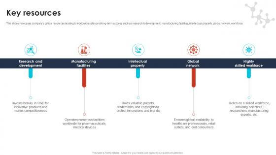 This slide showcases companys critical resources leading to worldwide sales and long-term success such as research and development, manufacturing facilities, intellectual property, global network, workforce. Slidegeeks is here to make your presentations a breeze with Key Resources Pharma Industry Business Canvas Model BMC SS V With our easy-to-use and customizable templates, you can focus on delivering your ideas rather than worrying about formatting. With a variety of designs to choose from, you are sure to find one that suits your needs. And with animations and unique photos, illustrations, and fonts, you can make your presentation pop. So whether you are giving a sales pitch or presenting to the board, make sure to check out Slidegeeks first This slide showcases companys critical resources leading to worldwide sales and long-term success such as research and development, manufacturing facilities, intellectual property, global network, workforce.