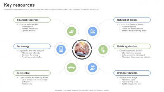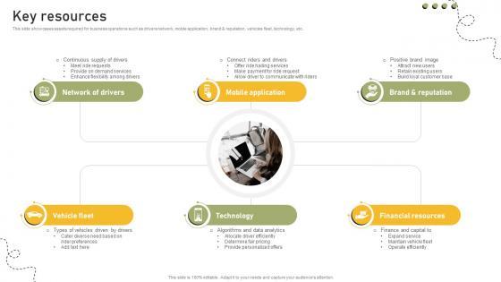 This slide showcases assets required for business operations such as drivers network, mobile application, brand and reputation, vehicles fleet, technology, etc. Slidegeeks is here to make your presentations a breeze with Key Resources Rideshare Platform Business Model BMC SS V With our easy-to-use and customizable templates, you can focus on delivering your ideas rather than worrying about formatting. With a variety of designs to choose from, you are sure to find one that suits your needs. And with animations and unique photos, illustrations, and fonts, you can make your presentation pop. So whether you are giving a sales pitch or presenting to the board, make sure to check out Slidegeeks first This slide showcases assets required for business operations such as drivers network, mobile application, brand and reputation, vehicles fleet, technology, etc.