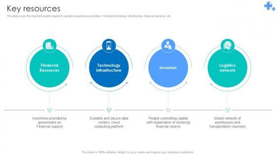 This slide showcases key assets of the company to deliver innovative products, encompassing human capital, electric vehicle technology, manufacturing facility, distribution and service network, and research and development. Slidegeeks is here to make your presentations a breeze with Key Resources Smart Transportation Solutions Provider Business Model BMC SS V With our easy to use and customizable templates, you can focus on delivering your ideas rather than worrying about formatting. With a variety of designs to choose from, you are sure to find one that suits your needs. And with animations and unique photos, illustrations, and fonts, you can make your presentation pop. So whether you are giving a sales pitch or presenting to the board, make sure to check out Slidegeeks first This slide showcases key assets of the company to deliver innovative products, encompassing human capital, electric vehicle technology, manufacturing facility, distribution and service network, and research and development.