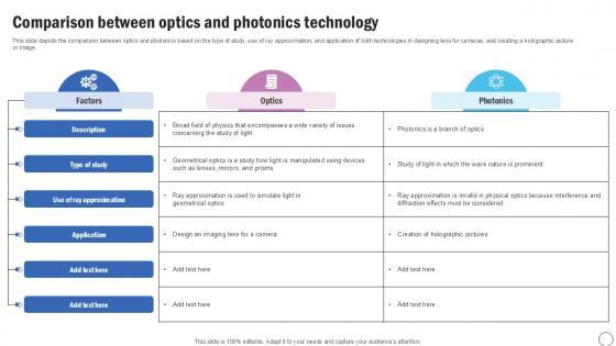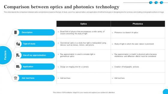 This slide depicts the comparison between optics and photonics based on the type of study, use of ray approximation, and application of both technologies in designing lens for cameras, and creating a holographic picture or image. Find highly impressive Fibers IT Comparison Between Optics And Photonics Technology on Slidegeeks to deliver a meaningful presentation. You can save an ample amount of time using these presentation templates. No need to worry to prepare everything from scratch because Slidegeeks experts have already done a huge research and work for you. You need to download Fibers IT Comparison Between Optics And Photonics Technology for your upcoming presentation. All the presentation templates are 100 percent editable and you can change the color and personalize the content accordingly. Download now This slide depicts the comparison between optics and photonics based on the type of study, use of ray approximation, and application of both technologies in designing lens for cameras, and creating a holographic picture or image.