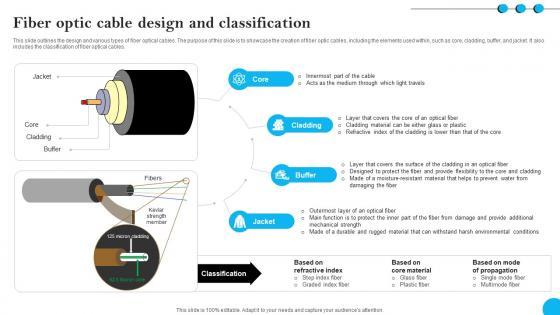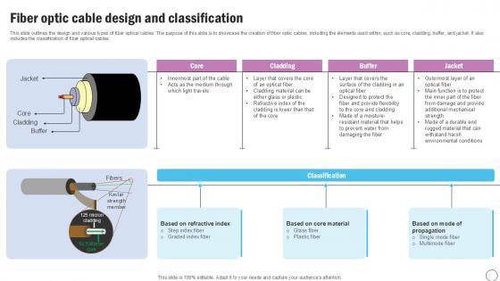 This slide outlines the design and various types of fiber optical cables. The purpose of this slide is to showcase the creation of fiber optic cables, including the elements used within, such as core, cladding, buffer, and jacket. It also includes the classification of fiber optical cables. Boost your pitch with our creative Fiber Optic Cable Design And Classification Fibers IT. Deliver an awe-inspiring pitch that will mesmerize everyone. Using these presentation templates you will surely catch everyones attention. You can browse the ppts collection on our website. We have researchers who are experts at creating the right content for the templates. So you do not have to invest time in any additional work. Just grab the template now and use them. This slide outlines the design and various types of fiber optical cables. The purpose of this slide is to showcase the creation of fiber optic cables, including the elements used within, such as core, cladding, buffer, and jacket. It also includes the classification of fiber optical cables.