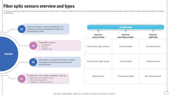 This slide represents the optical fiber sensors overview and their various types. The purpose of this slide is to give an overview of fiber optic sensors and their classification based on sensor location, operating principles, and based on application. Create an editable Fiber Optic Sensors Overview And Types Fibers IT that communicates your idea and engages your audience. Whether you are presenting a business or an educational presentation, pre-designed presentation templates help save time. Fiber Optic Sensors Overview And Types Fibers IT is highly customizable and very easy to edit, covering many different styles from creative to business presentations. Slidegeeks has creative team members who have crafted amazing templates. So, go and get them without any delay. This slide represents the optical fiber sensors overview and their various types. The purpose of this slide is to give an overview of fiber optic sensors and their classification based on sensor location, operating principles, and based on application.