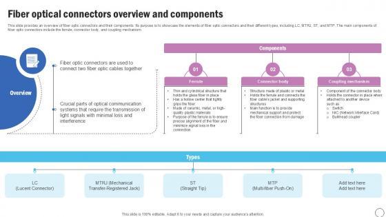 This slide provides an overview of fiber optic connectors and their components. Its purpose is to showcase the elements of fiber optic connectors and their different types, including LC, MTRJ, ST, and MTP. The main components of fiber optic connectors include the ferrule, connector body, and coupling mechanism. Slidegeeks is one of the best resources for PowerPoint templates. You can download easily and regulate Fiber Optical Connectors Overview And Components Fibers IT for your personal presentations from our wonderful collection. A few clicks is all it takes to discover and get the most relevant and appropriate templates. Use our Templates to add a unique zing and appeal to your presentation and meetings. All the slides are easy to edit and you can use them even for advertisement purposes. This slide provides an overview of fiber optic connectors and their components. Its purpose is to showcase the elements of fiber optic connectors and their different types, including LC, MTRJ, ST, and MTP. The main components of fiber optic connectors include the ferrule, connector body, and coupling mechanism.