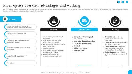 This slide gives an overview of optical fiber technology, including its working and benefits. The purpose of this slide is to showcase fiber optics, their pros, application areas, and the working process. The application areas include computer networking and broadcasting, internet and cable television, etc. Want to ace your presentation in front of a live audience Our Fiber Optics Overview Advantages And Working Fibers IT can help you do that by engaging all the users towards you. Slidegeeks experts have put their efforts and expertise into creating these impeccable powerpoint presentations so that you can communicate your ideas clearly. Moreover, all the templates are customizable, and easy-to-edit and downloadable. Use these for both personal and commercial use. This slide gives an overview of optical fiber technology, including its working and benefits. The purpose of this slide is to showcase fiber optics, their pros, application areas, and the working process. The application areas include computer networking and broadcasting, internet and cable television, etc.