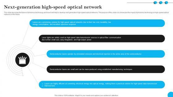 This slide describes the future of photonics technology and how it will help to develop next-generation high-speed optical networks. The purpose of this slide is to showcase the impact of photonics technology on high-speed optical networks in the future. Retrieve professionally designed Fibers IT Next Generation High Speed Optical Network to effectively convey your message and captivate your listeners. Save time by selecting pre-made slideshows that are appropriate for various topics, from business to educational purposes. These themes come in many different styles, from creative to corporate, and all of them are easily adjustable and can be edited quickly. Access them as PowerPoint templates or as Google Slides themes. You do not have to go on a hunt for the perfect presentation because Slidegeeks got you covered from everywhere. This slide describes the future of photonics technology and how it will help to develop next-generation high-speed optical networks. The purpose of this slide is to showcase the impact of photonics technology on high-speed optical networks in the future.