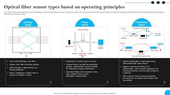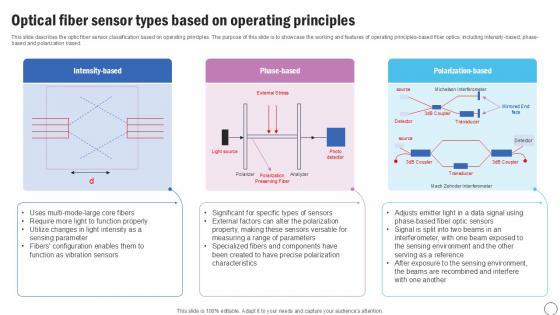 This slide describes the optic fiber sensor classification based on operating principles. The purpose of this slide is to showcase the working and features of operating principles-based fiber optics, including intensity-based, phase-based and polarization based. Slidegeeks has constructed Fibers IT Optical Fiber Sensor Types Based On Operating Principles after conducting extensive research and examination. These presentation templates are constantly being generated and modified based on user preferences and critiques from editors. Here, you will find the most attractive templates for a range of purposes while taking into account ratings and remarks from users regarding the content. This is an excellent jumping-off point to explore our content and will give new users an insight into our top-notch PowerPoint Templates. This slide describes the optic fiber sensor classification based on operating principles. The purpose of this slide is to showcase the working and features of operating principles-based fiber optics, including intensity-based, phase-based and polarization based.