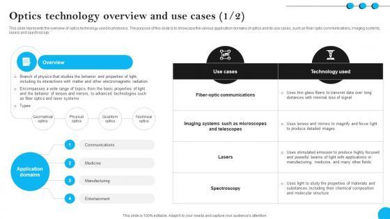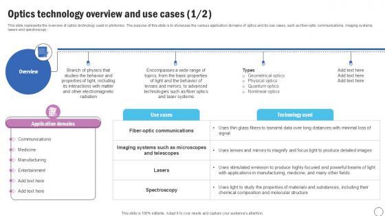 This slide represents the overview of optics technology used in photonics. The purpose of this slide is to showcase the various application domains of optics and its use cases, such as fiber-optic communications, imaging systems, lasers and spectroscopy. Here you can discover an assortment of the finest PowerPoint and Google Slides templates. With these templates, you can create presentations for a variety of purposes while simultaneously providing your audience with an eye-catching visual experience. Download Fibers IT Optics Technology Overview And Use Cases to deliver an impeccable presentation. These templates will make your job of preparing presentations much quicker, yet still, maintain a high level of quality. Slidegeeks has experienced researchers who prepare these templates and write high-quality content for you. Later on, you can personalize the content by editing the Fibers IT Optics Technology Overview And Use Cases. This slide represents the overview of optics technology used in photonics. The purpose of this slide is to showcase the various application domains of optics and its use cases, such as fiber-optic communications, imaging systems, lasers and spectroscopy.