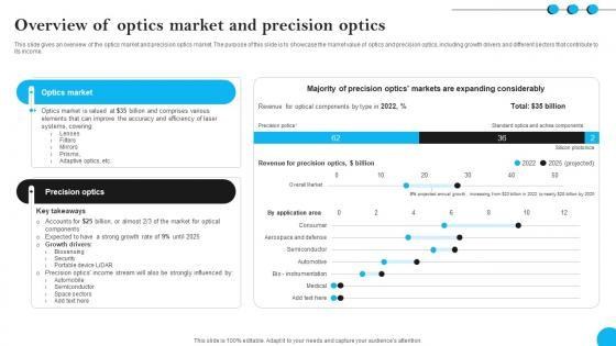 This slide gives an overview of the optics market and precision optics market. The purpose of this slide is to showcase the market value of optics and precision optics, including growth drivers and different sectors that contribute to its income.Create an editable Overview Of Optics Market Silicon Photonics SiPh It Ppt Slide that communicates your idea and engages your audience. Whether you are presenting a business or an educational presentation, pre-designed presentation templates help save time. Overview Of Optics Market Silicon Photonics SiPh It Ppt Slide is highly customizable and very easy to edit, covering many different styles from creative to business presentations. Slidegeeks has creative team members who have crafted amazing templates. So, go and get them without any delay. This slide gives an overview of the optics market and precision optics market. The purpose of this slide is to showcase the market value of optics and precision optics, including growth drivers and different sectors that contribute to its income.