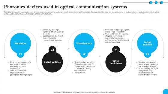 This slide illustrates the various photonics devices used in optical communication systems to increase or amplify the signals. The purpose of this slide is to give an overview of photonics devices, including modulators, optical switches, optical amplifiers, photodetectors, and optical multiplexers. Want to ace your presentation in front of a live audience Our Fibers IT Photonics Devices Used In Optical Communication Systems can help you do that by engaging all the users towards you. Slidegeeks experts have put their efforts and expertise into creating these impeccable powerpoint presentations so that you can communicate your ideas clearly. Moreover, all the templates are customizable, and easy-to-edit and downloadable. Use these for both personal and commercial use. This slide illustrates the various photonics devices used in optical communication systems to increase or amplify the signals. The purpose of this slide is to give an overview of photonics devices, including modulators, optical switches, optical amplifiers, photodetectors, and optical multiplexers.