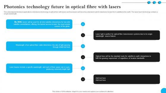 This slide depicts the future applications of photonics technology in optical fibre with lasers and how lasers will become a standard route for data transmission from satellites to the earth. The laser beam technology contains a single wavelength. Present like a pro with Fibers IT Photonics Technology Future In Optical Fibre With Lasers. Create beautiful presentations together with your team, using our easy-to-use presentation slides. Share your ideas in real-time and make changes on the fly by downloading our templates. So whether you are in the office, on the go, or in a remote location, you can stay in sync with your team and present your ideas with confidence. With Slidegeeks presentation got a whole lot easier. Grab these presentations today. This slide depicts the future applications of photonics technology in optical fibre with lasers and how lasers will become a standard route for data transmission from satellites to the earth. The laser beam technology contains a single wavelength.