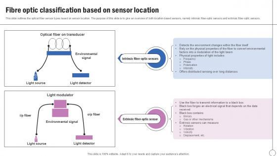This slide outlines the optical fiber sensor types based on sensor location. The purpose of this slide is to give an overview of both location-based sensors, namely intrinsic fiber-optic sensors and extrinsic fiber-optic sensors. This Fibre Optic Classification Based On Sensor Location Fibers IT is perfect for any presentation, be it in front of clients or colleagues. It is a versatile and stylish solution for organizing your meetings. The Fibre Optic Classification Based On Sensor Location Fibers IT features a modern design for your presentation meetings. The adjustable and customizable slides provide unlimited possibilities for acing up your presentation. Slidegeeks has done all the homework before launching the product for you. So, do not wait, grab the presentation templates today This slide outlines the optical fiber sensor types based on sensor location. The purpose of this slide is to give an overview of both location-based sensors, namely intrinsic fiber-optic sensors and extrinsic fiber-optic sensors.