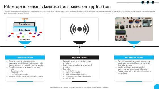 This slide represents the types of optical fiber sensors based on application. The purpose of this slide is to highlight the application-based fiber optics sensors such as chemical, physical and bio-medical sensors. It also includes the application domains for these sensors. Welcome to our selection of the Fibre Optic Sensor Classification Based On Application Fibers IT. These are designed to help you showcase your creativity and bring your sphere to life. Planning and Innovation are essential for any business that is just starting out. This collection contains the designs that you need for your everyday presentations. All of our PowerPoints are 100Percent editable, so you can customize them to suit your needs. This multi-purpose template can be used in various situations. Grab these presentation templates today. This slide represents the types of optical fiber sensors based on application. The purpose of this slide is to highlight the application-based fiber optics sensors such as chemical, physical and bio-medical sensors. It also includes the application domains for these sensors.