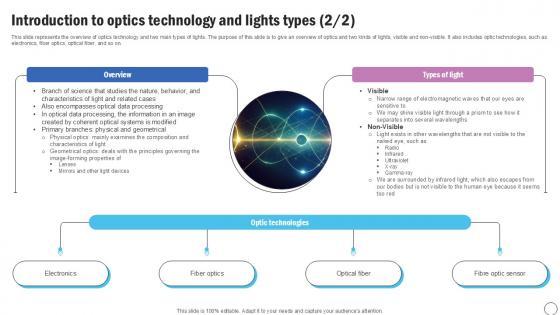 This slide represents the overview of optics technology and two main types of lights. The purpose of this slide is to give an overview of optics and two kinds of lights, visible and non-visible. It also includes optic technologies, such as electronics, fiber optics, optical fiber, and so on. This modern and well-arranged Fibers IT Introduction To Optics Technology And Lights Types provides lots of creative possibilities. It is very simple to customize and edit with the Powerpoint Software. Just drag and drop your pictures into the shapes. All facets of this template can be edited with Powerpoint, no extra software is necessary. Add your own material, put your images in the places assigned for them, adjust the colors, and then you can show your slides to the world, with an animated slide included. This slide represents the overview of optics technology and two main types of lights. The purpose of this slide is to give an overview of optics and two kinds of lights, visible and non-visible. It also includes optic technologies, such as electronics, fiber optics, optical fiber, and so on.