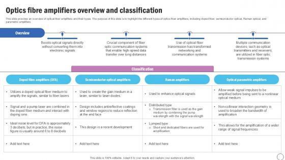 This slide provides an overview of optical fiber amplifiers and their types. The purpose of this slide is to highlight the different types of optics fiber amplifiers, including doped fiber, semiconductor optical, Raman optical, and parametric amplifiers. Presenting this PowerPoint presentation, titled Fibers IT Optics Fibre Amplifiers Overview And Classification, with topics curated by our researchers after extensive research. This editable presentation is available for immediate download and provides attractive features when used. Download now and captivate your audience. Presenting this Fibers IT Optics Fibre Amplifiers Overview And Classification. Our researchers have carefully researched and created these slides with all aspects taken into consideration. This is a completely customizable Fibers IT Optics Fibre Amplifiers Overview And Classification that is available for immediate downloading. Download now and make an impact on your audience. Highlight the attractive features available with our PPTs. This slide provides an overview of optical fiber amplifiers and their types. The purpose of this slide is to highlight the different types of optics fiber amplifiers, including doped fiber, semiconductor optical, Raman optical, and parametric amplifiers.