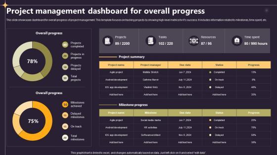 This slide showcases dashboard for overall progress of project management. This template focuses on tracking projects by showing high-level metrics for its success. It includes information related to milestones, time spent, etc. This modern and well-arranged Closing A Project By Fulfilling Overview Of Planning Project In An Organisation PM SS V provides lots of creative possibilities. It is very simple to customize and edit with the Powerpoint Software. Just drag and drop your pictures into the shapes. All facets of this template can be edited with Powerpoint, no extra software is necessary. Add your own material, put your images in the places assigned for them, adjust the colors, and then you can show your slides to the world, with an animated slide included. This slide showcases dashboard for overall progress of project management. This template focuses on tracking projects by showing high-level metrics for its success. It includes information related to milestones, time spent, etc.