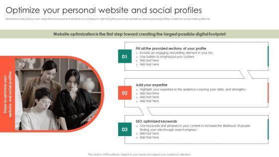 Mentioned slide portrays keys steps that will assist an individual or a company in optimizing their personal website as well as personal profiles created on social media platforms.Are you in need of a template that can accommodate all of your creative concepts This one is crafted professionally and can be altered to fit any style. Use it with Google Slides or PowerPoint. Include striking photographs, symbols, depictions, and other visuals. Fill, move around, or remove text boxes as desired. Test out color palettes and font mixtures. Edit and save your work, or work with colleagues. Download Comprehensive Personal Branding Guidelines Optimize Your Personal Website And Social Profiles Template PDF and observe how to make your presentation outstanding. Give an impeccable presentation to your group and make your presentation unforgettable.