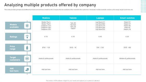 This slide provides glimpse about different products and services created by the company that are available in the market for the customers. It includes models available, reviews, price range, target customers, etc. Create an editable Analyzing Multiple Products Offered Business Sales Enhancement Campaign Portrait Pdf that communicates your idea and engages your audience. Whether you are presenting a business or an educational presentation, pre designed presentation templates help save time. Analyzing Multiple Products Offered Business Sales Enhancement Campaign Portrait Pdf is highly customizable and very easy to edit, covering many different styles from creative to business presentations. Slidegeeks has creative team members who have crafted amazing templates. So, go and get them without any delay. This slide provides glimpse about different products and services created by the company that are available in the market for the customers. It includes models available, reviews, price range, target customers, etc.