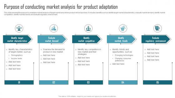This slide presents the purpose to undertake market analysis of target market area where product will be launched. It includes benefits such as identify target market characteristics, evaluate market demand, identify market competition, identify markets trends and evaluate regulatory environment. Do you have to make sure that everyone on your team knows about any specific topic I yes, then you should give Effective Product Adaptation Purpose Of Conducting Market Analysis For Product Professional Pdf a try. Our experts have put a lot of knowledge and effort into creating this impeccable Effective Product Adaptation Purpose Of Conducting Market Analysis For Product Professional Pdf You can use this template for your upcoming presentations, as the slides are perfect to represent even the tiniest detail. You can download these templates from the Slidegeeks website and these are easy to edit. So grab these today This slide presents the purpose to undertake market analysis of target market area where product will be launched. It includes benefits such as identify target market characteristics, evaluate market demand, identify market competition, identify markets trends and evaluate regulatory environment.