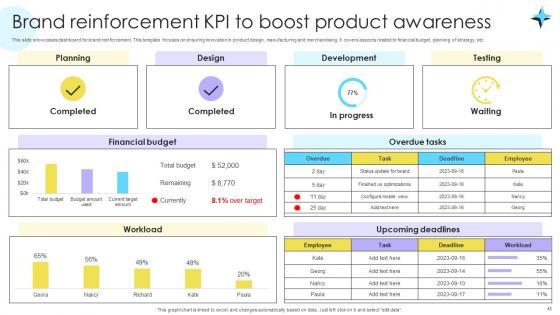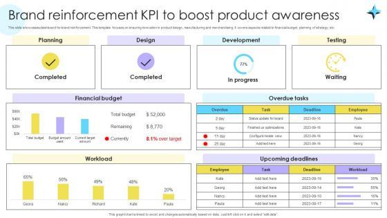 This slide showcases dashboard for brand reinforcement. This template focuses on ensuring innovation in product design, manufacturing and merchandising. It covers aspects related to financial budget, planning of strategy, etc. Want to ace your presentation in front of a live audience Our Brand Reinforcement KPI To Boost Product Encouraging Repetitive Customer Purchase Ppt Presentation can help you do that by engaging all the users towards you. Slidegeeks experts have put their efforts and expertise into creating these impeccable powerpoint presentations so that you can communicate your ideas clearly. Moreover, all the templates are customizable, and easy-to-edit and downloadable. Use these for both personal and commercial use. This slide showcases dashboard for brand reinforcement. This template focuses on ensuring innovation in product design, manufacturing and merchandising. It covers aspects related to financial budget, planning of strategy, etc.