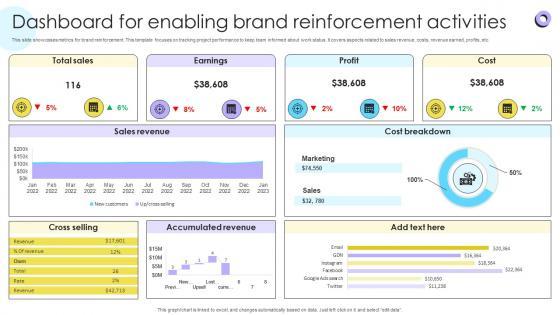 This slide showcases metrics for brand reinforcement. This template focuses on tracking project performance to keep team informed about work status. It covers aspects related to sales revenue, costs, revenue earned, profits, etc. From laying roadmaps to briefing everything in detail, our templates are perfect for you. You can set the stage with your presentation slides. All you have to do is download these easy-to-edit and customizable templates. Dashboard For Enabling Brand Reinforcement Encouraging Repetitive Customer Purchase Ppt Slide will help you deliver an outstanding performance that everyone would remember and praise you for. Do download this presentation today. This slide showcases metrics for brand reinforcement. This template focuses on tracking project performance to keep team informed about work status. It covers aspects related to sales revenue, costs, revenue earned, profits, etc.