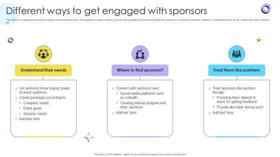This slide showcases various ways to engage with potential sponsors. This template focuses on making sponsorship compelling and enhancing attendee experience. It includes information related to understanding their needs, treating them likes partners, etc. Present like a pro with Different Ways To Get Engaged With Sponsors Encouraging Repetitive Customer Purchase Ppt Example. Create beautiful presentations together with your team, using our easy-to-use presentation slides. Share your ideas in real-time and make changes on the fly by downloading our templates. So whether you are in the office, on the go, or in a remote location, you can stay in sync with your team and present your ideas with confidence. With Slidegeeks presentation got a whole lot easier. Grab these presentations today. This slide showcases various ways to engage with potential sponsors. This template focuses on making sponsorship compelling and enhancing attendee experience. It includes information related to understanding their needs, treating them likes partners, etc.